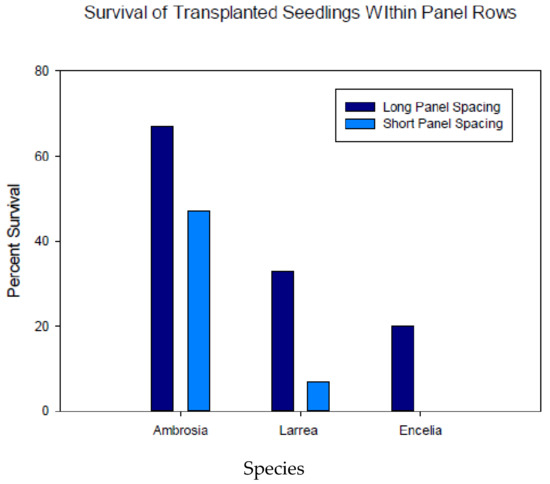 One-year-old seedlings were transplanted into six rows of the solar facility to assess their survival over the monitoring period. Encelia virginensis, L. tridentata, and A. dumosa seedlings were planted in the short-spacing and long-spacing areas at all panel locations (replicated three times for each spacing). Plants were watered weekly (1 L) during a two-month establishment period and then received no additional water for the duration of the experiment. Survival was assessed on a quarterly basis. Data were analyzed using descriptive statistics, analysis of variance, and linear and multiple regression analysis (Sigmaplot 12.5, Systat Software, San Jose, CA, USA, and R Core Team [44]).
