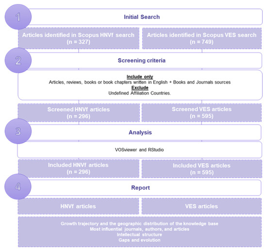 To analyze the rapid growth and complexity associated with research on HNVf and VES, bibliometric analysis provides a systematic and unbiased way to map out the vast domain of knowledge. It not only captures the most influential works and emerging themes but also enables identification of potential gaps and trends in the research community [66,67]. The technique unveils pivotal intersections across diverse research areas, highlighting collaborative patterns and setting the stage for future interdisciplinary research [68,69,70]. By employing this approach, our study aims to present a thorough overview of the existing body of knowledge on HNVf and VES [54,71,72].