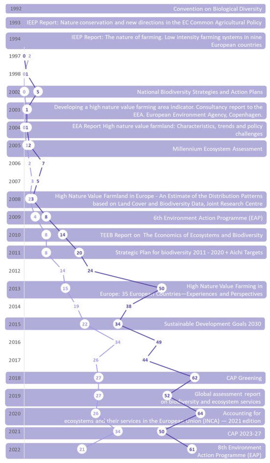 The foundation stages for the exploration of HNVf and VES research originated in 1992 (Figure 2), highlighted by the Convention on Biological Diversity [83], which underscored the value of preserving biological diversity, making sustainable use of its elements, and distributing benefits resulting from the exploitation of genetic resources fairly and equally. In subsequent years, vital reports, particularly from the IEEP [84,85], emphasized the importance of conserving European farmlands known for their biodiversity richness. From 1997 to 2010, regarded as the foundation phase, both realms of research experienced a modest but steady increase in publications, with only 7% of documents produced during this period. Also, it was during this period that new and already existent frameworks and policies laid the groundwork for understanding and preserving biodiversity on agricultural land. The term HNVf, introduced by Baldock et al. [86], gained traction during this phase, with an emphasis on conservation value in Europe, especially through the continuation of low-intensity farming systems [87,88]. During the same period, the domain of VES research was boosted by key frameworks such as the Millennium Ecosystem Assessment (MEA) [89], which elucidated the economic and societal value of ecosystems. The Economics of Ecosystems and Biodiversity (TEEB) [20] report further anchored the significance of VES, emphasizing the need to integrate ecological and economic dimensions in assessing biodiversity and ecosystem services.