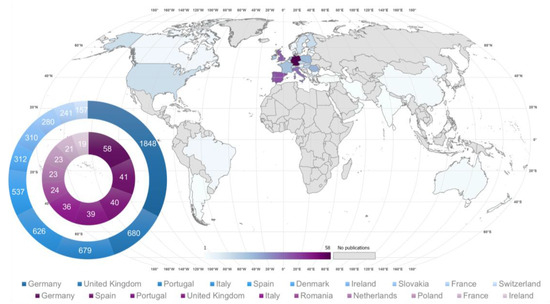 Regarding the geographic distribution of the published documents, 47 countries contributed to HNVf research. European countries were the most productive (97% of all publications). Among European countries, Germany, Portugal, Spain, the United Kingdom, and Italy were the top five publishing countries, contributing 56% of published documents.