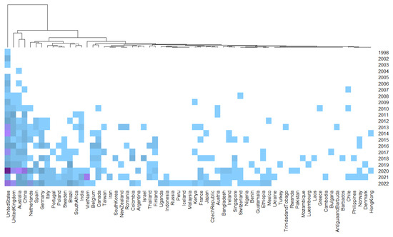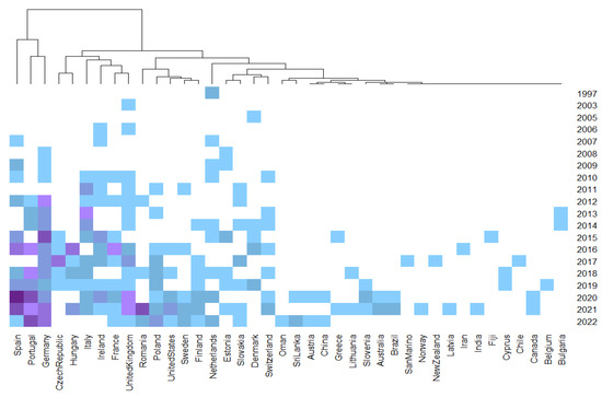 Heatmap and dendrogram for the number of documents per country and year of publication for VES research (purple = higher number of publications; light blue = lower number of publications).