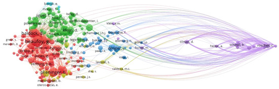 The co-citation network (Figure 8) highlighted Beaufoy G., Plieninger T., and Baldock D. as central figures, frequently cited and anchoring the core HNVf research themes found predominantly in the red cluster. This dense cluster represented a well-established research foundation. In contrast, the isolated purple cluster pointed to niche areas or differing theoretical perspectives. Also, it is notable that some authors, the standouts in co-citations analysis, were not as prominent among the most productive or cited authors, suggesting that their broader contributions focused on the HNV knowledge base (Table A2). Overall, the HNVf literature landscape appeared to be led by influential voices, enriched by diverse topics, and marked by a dynamic, interconnected research community.