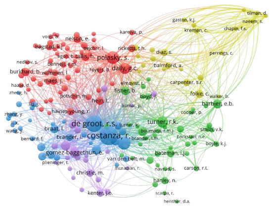 Figure 9 offers a detailed visualization of the co-citation dynamics within the VES research landscape. Five distinct clusters were representative of the varied thematic concentrations within VES studies. Unlike the patterns observed in HNVf research, the top-tier authors in VES research demonstrated a balanced presence across the network, reinforcing the idea of a well-integrated research community. The notable scholars were Costanza, De Groot, and Polasky. Their prominence not only highlighted their individual contributions but also established these authors as foundational pillars in VES research.