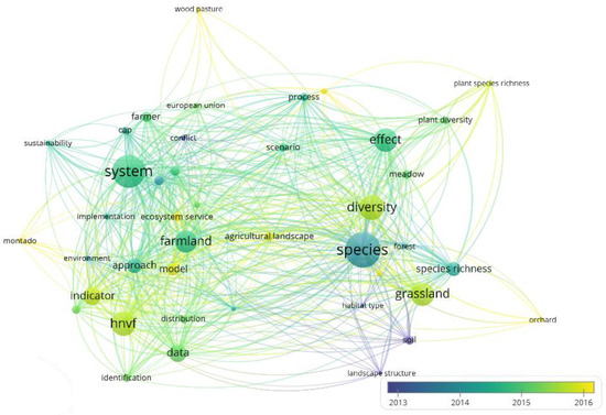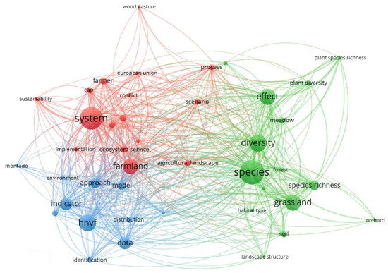 The network of word co-occurrence showed three generic clusters with very similar sizes and shapes (Figure 10). The separation between the blue and red clusters from the green cluster suggested a weaker correlation. This implied that the green cluster publications delved into distinct topics compared to those in the blue and red clusters. The blue cluster encompassed terms associated with methodologies for identifying and analyzing HNVf. In contrast, the red cluster pertained to the theoretical significance of HNVf and its associated policies. Notably, this cluster incorporated the term ES, underscoring the emphasis on considering these in policy formulation. Meanwhile, the green cluster centered around biodiversity research. Given the terminologies present in this cluster, it can be inferred that species richness served as a prevalent indicator for HNVf identification. However, given the noticeable distance between the red and blue clusters from the green cluster, there was a clear delineation between documents centered on species richness and diversity and those emphasizing HNVf monitoring and identification methodologies.
