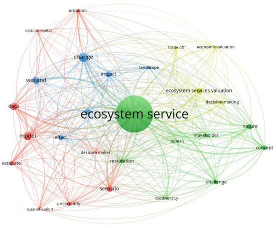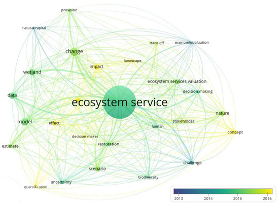 Despite the temporal shifts in thematic priorities, most terms maintained a similar node size, suggesting that while the focal points of research evolved, many of these themes remained consistently relevant, each contributing a pivotal piece to the holistic understanding of ES.
