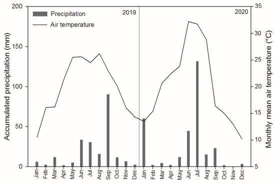 Precipitation and air temperature at the study sites in 2019 and 2020.