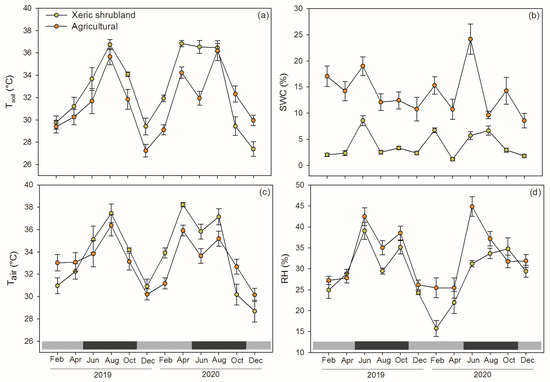 The temperature (both Tair and Tsoil) and water availability (RH and SWC) patterns coincide with the rainy and dry seasons of the study site [21,38]. However, in the agricultural plots, the patterns and levels of water availability were positively affected by irrigation throughout the period. The low-temperature values for the agricultural plots could also be explained by the irrigation and the vegetation cover, which buffered the temperature [39].