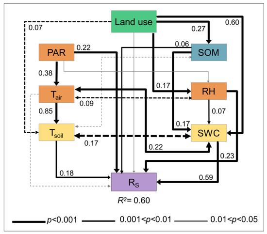Furthermore, the model which incorporated land use change (Figure 6) showed a good data fit (p = 0.95, NFI = 0.99, GFI = 0.99, and RMSEA < 0.001), explaining a high proportion of the effect of land use change on the RS (R2 = 0.60), in addition to environmental and soil variables. This model shows that land use change has a strong positive effect on SOM (0.27), a positive effect on RH (0.17), and a slight negative effect on Tsoil (0.07). However, the SWC maintains a strong positive effect over the RS (0.60).
