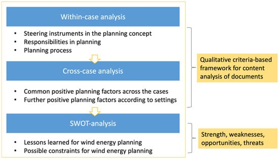 The case analysis method includes three steps. First, documents in the form of plans, planning documents and guidelines were analyzed referring to the selected case studies in a within-case analysis [,]. A content analysis was applied to derive themes and trends in wind energy planning. This included the marine spatial plans, the Area Development Plan for the German offshore case study, the national wind energy strategy for the Swedish case study [,,], and the German Onshore Wind Energy Act (WindBG). In addition, literature associated with the cases was referred to according to a keyword search of relevant databases (e.g., Web of Knowledge, Semantic Scholar, Google Scholar) (Figure 2).