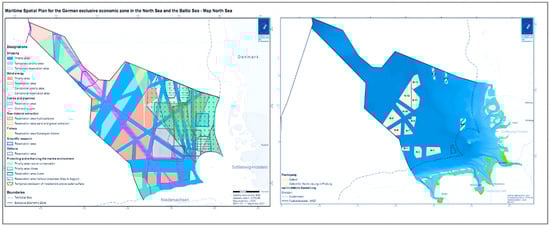 Marine spatial plan (left) and Area Development Plan (right) for the German EEZ North Sea (copyright by BSH [,]).