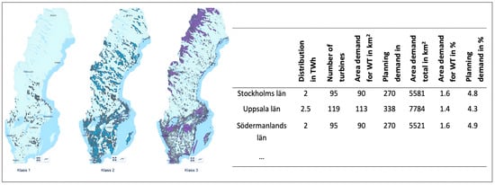 Class 1, 2 and 3 areas identifying the suitability for wind energy (at a height of 150 m and an average wind power of 400 W/m2) (left), and extract of the table for regional wind energy development demand for Swedish counties (län) (right) (copyright by Swedish Environmental Protection Agency and Swedish Energy Agency []).