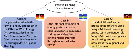 Upon analyzing the factors that lead to a positive planning environment across the three cases, several key characteristics stand out. These include a focus on clearly tiered goals and objectives, while shifting the site analysis to potential wind energy sites, limitations on available land or spatial resources. It incorporates also subsequent balancing processes that take into account the competing interests of various stakeholders (Figure 5).