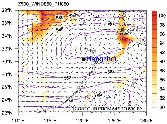 The ERA5 reanalysis of geopotential height at 500 hPa (solid lines), wind speed (arrow), and relative humidity (shading) at 850 hPa averaged from 09:00 to 18:00 on 26 July 2018. The black dot indicates the location of Hangzhou.