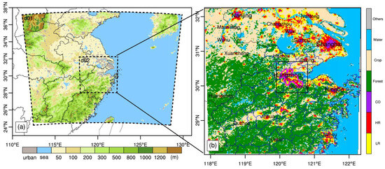 The (a) simulated domain d01 with terrain (m) and (b) land use in domain d02. The black rectangle box (119.9–120.8° E, 29.8–30.7° N) represents the control region of this heavy rain event. The magenta solid line in (b) indicates the Hangzhou–Shaoxing mega-city with an urban fraction ≥0.2. The LR, HR, and CO in (b) represent the land use type of low-density residential, high-density residential, and commercial, respectively.