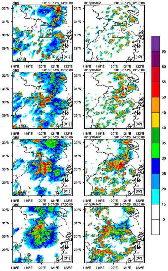 Comparison of the (a1–d1) observed and (a2–d2) simulated (the member of “m16p8s4u2” in ENCTL, CTL for short) composite radar reflectivity (dBZ) at four selected times on 26 July 2018. Note an approximate shift of 1.5 h between the simulation and observation.