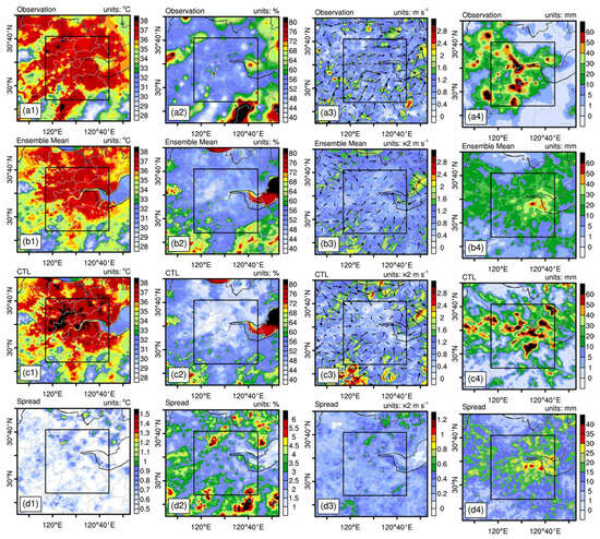 Distribution of the 2 m temperature (°C) averaged during 10:00 to 13:00 BST on 26 July 2018: (a1) observation, (b1) ensemble mean, (c1) CTL run, and (d1) spread; (a2–d2) the same as (a1–d1) but for the 2 m mixing ratio (g kg−1); (a3–d3) the same as (a1–d1) but for the 10 m wind (m s−1); (a4–d4) similar to (a1–d1) but for the accumulated precipitation (mm) from 13:00 to 18:00 BST on 26 July 2018.