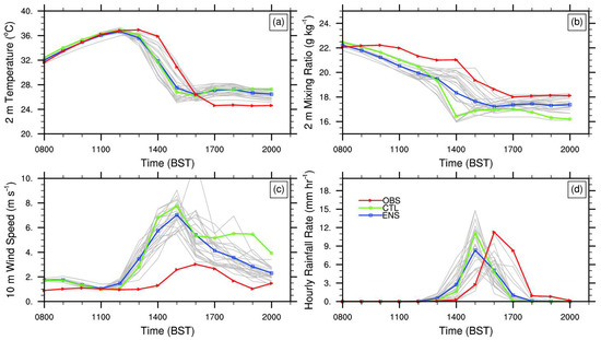 Time series of the (a) 2 m temperature (°C), (b) 2 m mixing ratio (g kg−1), (c) 10 m wind speed (m s−1), and (d) precipitation (mm) averaged over the control region from 08:00 to 20:00 BST on 26 July 2018. The red line denotes observation, the gray lines are the 24 ensemble members, the green line is the CTL (i.e., m16p8s4u2 in ENCTL), and the blue line represents the ensemble mean.