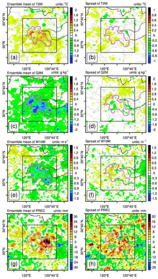 The impact of urbanization is first examined by comparing the differences in T2M, Q2M, WS10M, and accumulated precipitation between ENCTL and ENNoUB (Figure 6). The increase in the ensemble mean of T2M is 0.4–1.2 °C in the urban area, which is much larger than in the surrounding nonurban areas (Figure 6a). On the contrary, urbanization causes the mixing ratio to decrease by 0.5–1.8 g kg−1 in the urban area (Figure 6c). This is consistent with previous findings that evaporation in the urban area is reduced by impervious surfaces and reduced green vegetation fraction [46,72]. The wind speed decreases by 0.3–1.0 m s−1 in the urban area due to the drag effect of buildings (i.e., the pressure differences across individual roughness elements; Figure 6e). The positive anomaly center of precipitation is located at the junction between the urban area and Hangzhou Bay (Figure 6g). The presence of urban areas by the bayside can enhance the thermodynamic contrast between land and water that favors the water–land breeze front and promotes the formation of a convergence zone [73,74]. Meanwhile, the differences in the spread of T2M (Figure 6b), Q2M (Figure 6d), and WS10M (Figure 6f) are mainly concentrated in the urban area; however, the difference in the spread of precipitation occurs both in and out of the control region (Figure 6h). This suggests that the uncertainty brought about by the urban effect on precipitation occurs within the city and affects the surrounding areas to a similar extent. Notably, the spatial distribution of spread in precipitation is similar to that of the ensemble mean (Figure 6g), which indicates that the ensemble method is quite valuable for assessing the urban impact on local heavy precipitation [75].