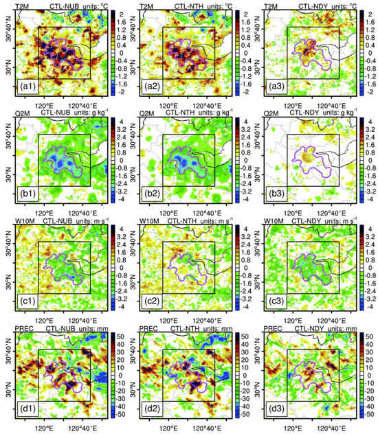 Differences in (a1–a3) 2 m temperature (°C) and (b1–b3) 2 m mixing ratio (g kg−1), (c1–c3) 10 m wind speed (m s−1) averaged during 10:00 to 13:00 BST on 26 July 2018, and (d1–d3) accumulated precipitation (mm) during 13:00 to 18:00 BST on 26 July 2018 between the control test (CTL) and (left) NoUB, (middle) NoTH, and (right) NoDY test.