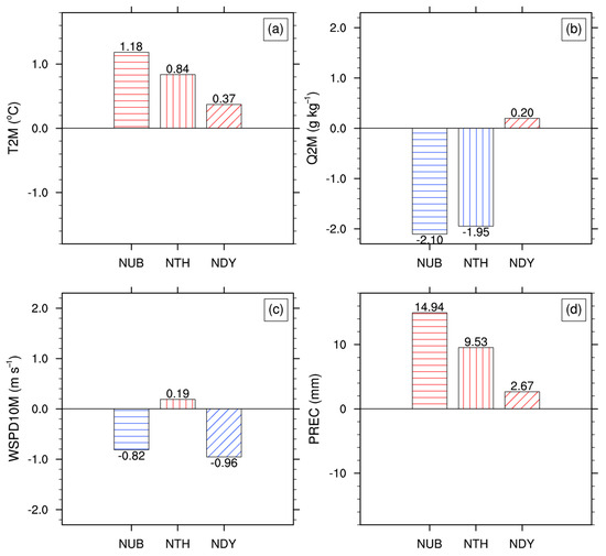 Comparison of the impacts of total, thermal, and dynamical effects of urbanization on (a) 2 m temperature (°C), (b) 2 m mixing ratio (g kg−1), and (c) 10 m wind speed (m s−1) averaged during 10:00 to 13:00 BST on 26 July 2018, and (d) accumulated precipitation (mm) averaged during 13:00 to 18:00 BST on 26 July 2018. The red column represents a positive contribution and the blue column represents a negative contribution.