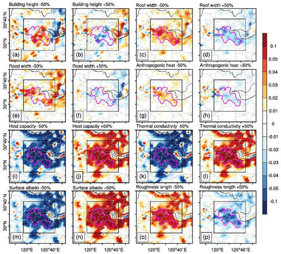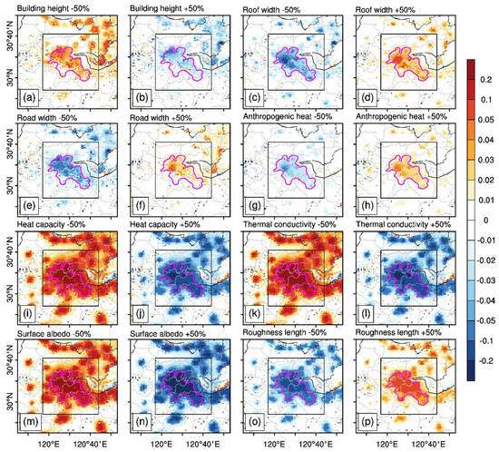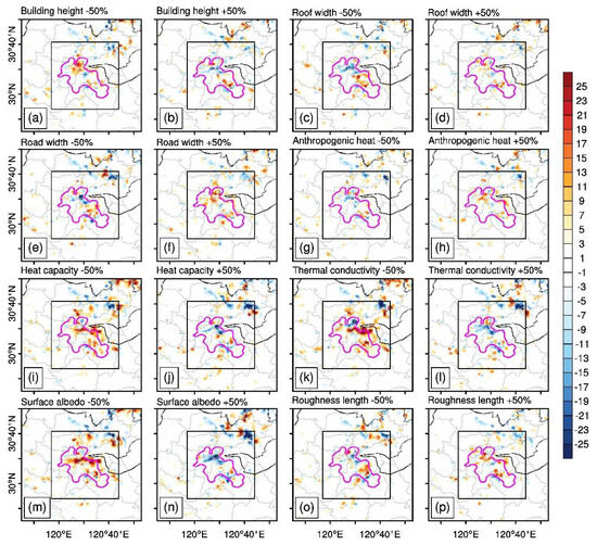 The same as Figure 9 but for the 2 m mixing ratio (g kg−1): (a) decreasing the building height; (b) increasing the building height; (c) decreasing the roof width; (d) increasing the roof width; (e) decreasing the road width; (f) increasing the road width; (g) de-creasing the anthropogenic heat; (h) increasing the anthropogenic heat; (i) decreasing the heat capacity; (j) increasing the heat capacity; (k) decreasing the thermal conductivity; (l) increasing the thermal conductivity; (m) decreasing the surface albedo; (n) increasing the surface albedo; (o) decreasing the roughness length; and (p) increasing the roughness length by 50%.