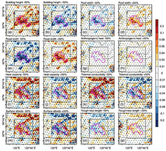 The same as Figure 9 but for the 10 m wind speed (m s−1): (a) decreasing the building height; (b) increasing the building height; (c) decreasing the roof width; (d) increasing the roof width; (e) decreasing the road width; (f) increasing the road width; (g) de-creasing the anthropogenic heat; (h) increasing the anthropogenic heat; (i) decreasing the heat capacity; (j) increasing the heat capacity; (k) decreasing the thermal conductivity; (l) increasing the thermal conductivity; (m) decreasing the surface albedo; (n) increasing the surface albedo; (o) decreasing the roughness length; and (p) increasing the roughness length by 50%.