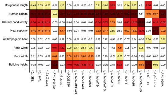 Figure 13 lists the differences in more meteorological variables (X-axis) averaged in the control region when increasing the values of the eight UCPs (Y-axis) by 50% individually to better illustrate the changes in the environmental conditions within urban areas. The surface albedo and the three structural parameters (i.e., building height, roof width, and road width) play an important role in the urban canopy radiation balance, i.e., changes in downward/upward shortwave radiation (SWDOWN/SWUP). The surface albedo is the parameter that has the most significant impact on most of the meteorological variables. Higher surface albedo reflects more shortwave radiation and reduces net shortwave radiation (NSW) entering the urban canopy, which leads to a decrease in both TSK and T2M. Previous studies also suggest that high surface albedo contributes significantly to reducing the TSK and canopy layer UHI [78,79]. For the effects of the three structural parameters, the effect of building height is opposite to those of roof width and road width, which is also consistent with the findings above (Figure 9, Figure 10 and Figure 11). The increase in building height (roof width/road width) leads to more (less) net radiation (RN) in the urban canopy and a decrease (increase) in TSK due to the longer (shorter) building shadow. The temperature gradient between the canopy and ground increases and causes more energy to be transported into the ground (GRDFLX), resulting in a decrease in T2M. On the other side, the heat capacity and thermal conductivity have a greater influence on the surface energy balance, i.e., changes in HFX and GRDFLX. Their increases mean that the building could store more energy in the urban canopy and conduct it into the ground, therefore causing a negative difference in both HFX and GRDFLX. The increase in roughness length enhances the mechanical turbulence of the boundary layer, causing an increase in UST. More heat (RN) is conducted to the upper boundary layer during the daytime, resulting in an increase in GRDFLX and a decrease in TSK. The anthropogenic heat is treated as an additional sensible heat source in the model, and its impact is relatively small compared to the other UCPs in this study.