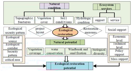 With the continuous growth of the global economy and the acceleration of urbanization, irrational land use and high-intensity urban construction activities have led to a series of ecological and environmental problems such as ecosystem degradation and landscape destruction. At the beginning of the 20th century, TER emerged in Germany and other countries, and the United Nations regarded the restoration of the ecosystem as the core condition required to solve the ecosystem problem, and related research is also gradually being carried out [,,,,]. China has entered a new stage of ecological civilization construction since the 18th National Congress of the Communist Party of China, and the CPC Central Committee views ecological civilization construction as a key blueprint for the sustainable development of China. Ecological civilization principles such as that “Clean waters and verdant mountains are as valued as mountains of gold and silver” have progressively become accepted by all individuals. Territorial space is crucial in this construction process, serving as an important carrier and spatial element. With the rapid advent of urbanization, the dichotomy between the space development and protection of land has become increasingly prominent. Issues such as inconsistent land space layout, ecological system destruction, disorganized construction land layout, and low cultivated land yield, require immediate attention. Implementing TER in this new era is critical to delivering the concept of an ecological civilization in its entirety, which is an important starting point for building a beautiful countryside and promoting rural revitalization, and a crucial task for China to realize its sustainable development strategy. The study of TER originated from Cairns’ research and has evolved into a systematic branch of ecology [,]. It has become an important area of investigation, encompassing various aspects such as TER zoning [,], TER benefit evaluation [,,], and TER technology and methods []. In recent years, there has been increasing scholarly attention on the issue of TER. Research in this field spans various scales (province, region, county) and focuses primarily on the following areas. Scholars use the theory of ESPs to identify ecological sources and corridors by integrating morphological spatial pattern analysis, the InVEST model, circuit theory, the minimum cumulative resistance model, cost–distance analysis, spatial syntax, and other methods. They establish a comprehensive resistance surface to construct ESPs for evaluating, managing, and optimizing land spatial ecological security in the study area [,,,,,,,,,,]. Various models and methods are used in the study of TER engineering to evaluate the ecological service value and benefits that TER projects provide [,,,,,]. These tools include the ordered probit model, ecological benefit evaluation model, social-ecological system framework, market value method, alternative engineering method, carbon tax law, and industrial oxygen production method. In the study of TER zoning, scholars have developed a framework for evaluating land space based on different aspects such as quality, pressure, state, potential, or function by constructing an ESP, the supply and demand relationship of ecosystem services, and a comprehensive index system [,,,,,,,,,]. The ERP is the basis for delineating ESPs and arranging TER projects. The ERP refers to the potential ability of diverse remediation actions being used to rectify and repair the disturbed and degraded ecological environment to improve the regional ecological environment following remediation. The ERP refers to the ability of an ecosystem to improve its service function after the construction of a TER project. The ERP is based on the ERNP, which analyzes the enhancement of regional ecological service functions considering natural factors such as the regional climate, soil, hydrology, terrain, and geomorphology. In this study, the ERNP mainly measures the potential for vegetation coverage, water conservation, windbreak and sand fixation, and biodiversity. ERP implementation is contingent on numerous variables. First, it depends on the ecological security situation in the region. The ESP is essential for the successful regulation and management of ecological processes. By constructing an ESP, it is possible to ensure the full performance of ecological functions, realize the effective and rational allocation of regional natural resources and green infrastructure, and ensure the ecological and material flow of essential natural resources, thereby achieving regional ecological security. The ESP is also the foundation of regional TER project construction. The ERP and ESP are intertwined in the process of TER planning and TER project layout in different regions, with ecologically significant sources and corridors being the primary locations requiring protection. Therefore, the greater the likelihood of a TER project layout, the closer the area is to the key area in the ESP. Second, SS contributes significantly to regional TER planning and implementation initiatives. Since TER planning entails an extensive scope and long-term issues necessitating major financial input from both state and local authorities, regional economic conditions and public support significantly impact implementation achievements. In conclusion, the ERP focuses on enhancing ecosystem services through TER initiatives and is supported by ERNP analyses based on natural variables such as climate and topography. In addition, constructing an ESP is crucial for effective regulation, ensuring the correct allocation of resources, and ensuring the necessary flow of materials. Finally, socioeconomic elements, such as local economic strength and public backing, are essential for the effective execution of TER initiatives. In the past, potential calculations mostly focused on the remediation potential of cultivated land [,], the consolidation potenti