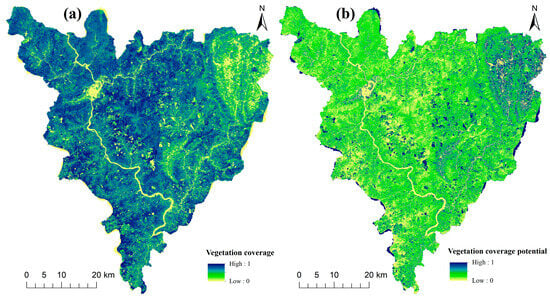 Vegetation coverage and vegetation coverage potential in Zhaoping County: (a) vegetation coverage levels; (b) vegetation coverage potential.