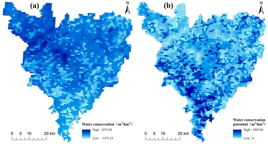 where TQp represents the water conservation potential; TQmax is the maximum value of water conservation in similar habitats to which the grid belongs; and TQ denotes the current water conservation in the study area.