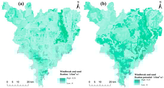 Windbreak and sand fixation levels and potential in Zhaoping County: (a) windbreak and sand fixation levels; (b) windbreak and sand fixatio potential.