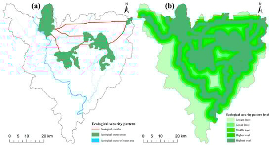 Ecological security pattern of Zhaoping County: (a) ecological security pattern; (b) ecological security pattern levels.