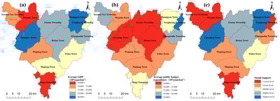 The ability for the social support of TER in Zhaoping County was analyzed. The data demonstrate a substantial gap between the average GDP levels of the various towns in Zhaoping County. Specifically, the northern area of Zhaoping, including Zhaoping and Huangyao, has a greater GDP than the relatively lower southern region, including the Muge Township (Figure 9a). This spatial distribution pattern is also reflected in the average public budget expenditure across Zhaoping County. The towns with higher expenditures are Zhaoping, Zouma Township, and Beituo, while the Muge Township and Huangyao have lower expenditures (Figure 9b). The classification results reveal that the majority of communities with a greater capacity for social support are located in the northern region. The municipality with the highest level of support capabilities is Zhaoping, followed by the Zouma Township, Huangyao, and Beiduo. The Muge Township in the south, Fenghuang Township in the east, Wenzhu, and Xianhui Yao Township in the north, have lower a support capacity (Figure 9c).