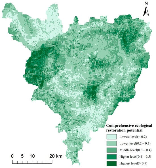 High-intensity land development and utilization activities have caused problems such as ecological environment destruction and ecosystem function degradation. As China strives to build an ecological civilization, TER is receiving increased attention. As the county is the primary unit for TER implementation, it is vital to examine the ERP. This research covers Zhaoping County in Hezhou City as a case study region, beginning with the definition of the TER objectives and the measurement of the ERNP, which includes plant coverage, water conservation, windbreak and sand fixation, and biodiversity. The ESP and SS are reviewed based on these readings to alter the ERNP for an appropriate ERP computation. The findings provide recommendations for the natural restoration, pattern optimization, and function enhancement of TER in Zhaoping County. This study reveals that the ERNP in Zhaoping County is mainly affected by ecological function, and there is a big gap between different potentials. The ERP values range from 0 to 1 when the ESP and SS components are taken into account. The majority of places with a higher potential value are located in the west and northeast of Zhaoping County. In comparison, the majority of areas with a lower potential value are located in the northwest and south. These comprehensive ERP findings can inform decisions regarding TER project placement, performance evaluation, and policy formulation.