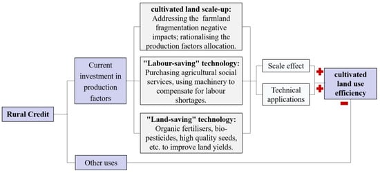 As the agents in cultivated land production activities, farmers directly influence CLUE through their allocation decisions and behavior with regard to production factors. Farm households in China rely on capital to purchase agricultural production factors as inputs to obtain agricultural outputs. Due to the natural characteristics of agricultural production, farm households may face seasonal financial constraints, leading to payment difficulties in purchasing production factors. The impact is pronounced for farm households that are more capital-dependent [23]. As a result, farmers are forced to make sub-optimal production decisions in the face of financial constraints [15]. Farmers may purchase less risky combinations of production factors or technologies, which could translate into productivity levels well below the optimum combination of inputs [17,24]. However, access to rural credit can alleviate the financial constraints of farmers to a certain extent and provide a strong incentive for farmers to increase their current investments in production factors [25]. In this way, output levels can be optimized to improve CLUE under conditions of limited cultivated land resources. Specifically, rural credit provides incentives for farmers to actively invest in purchasing farmland and technology factors and influences CLUE through cultivated land scale-up and technology application. We summarized the mechanism of rural credit impact on CLUE (Figure 1).