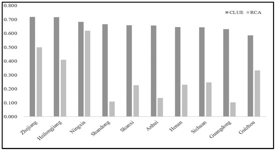 Mean values of CLUE and RCA for 10 provinces in the study area.