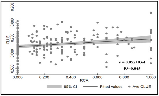 As shown in Figure 4, CLUE was positively correlated with RCA at the village level. RCA and CLUE had a positive linear relationship. This finding indicated that access to rural credit helped farmers increase CLUE. However, further econometric modeling is required to explore the relationship between the two to eliminate the confounding effects of other variables.