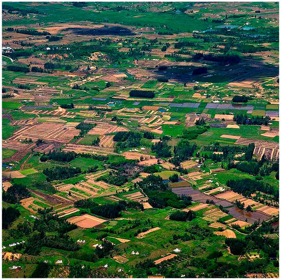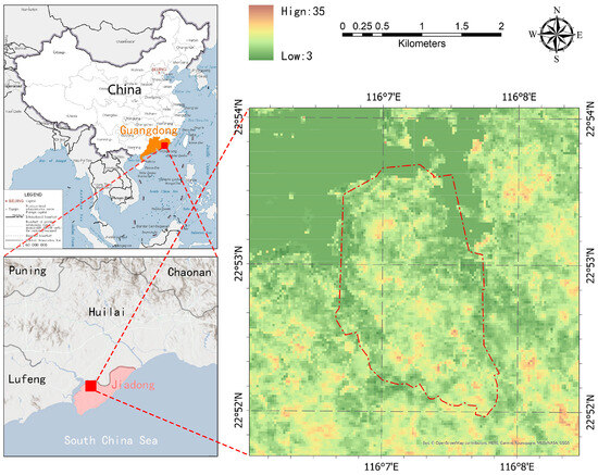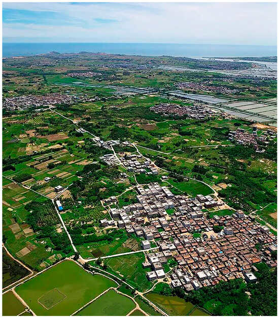 The study area lies in a peninsula of 4.52 km2, comprising six villages within Jiadong Town, Lufeng City (Figure 1). The terrain predominantly consists of hills and terraces, with elevations ranging from 6 to 30 m. The soil type is latosol, and the climate exhibits subtropical monsoon characteristics, with abundant rainfall during the rainy season. The average annual temperature stands at 21.8 °C. At the end of 2020, Jiadong Town’s population was 60,893 [47]. According to local records, the earliest village in Jiadong was established in 1264, when the economy was mainly based on fishing supplemented using agriculture [48]. In the following few hundred years, staple crops such as rice and sweet potatoes were cultivated, along with cash crops like sugarcane and peanuts [49]. Following the establishment of the People’s Republic of China in 1949, private land ownership was abolished, and collective agricultural production was enforced via people’s communes. During this period, under the leadership of the communist regime, there was a nationwide agricultural infrastructure movement, ‘in Agriculture, Learn from Dazhai’, which caused dramatic changes in farmland [50]. After 1980, the implementation of the reform and opening-up policy in China made the family unit retake charge of agricultural production, which caused families to shift from single-crop farming to diverse cash crops as the market economy developed. Post-2000, the process of urbanization accelerated with small-scale industries appearing in the countryside. In summary, the rural landscape changed dramatically during the late 20th and early 21st centuries, with significant re-organization of agricultural land succeeded by increasingly rapid urbanization (Figure 2 and Figure 3). The historic landscape of the area has not been studied previously. It was chosen because it is representative of the wider region and because a good range of historical and current spatial data are available for study.