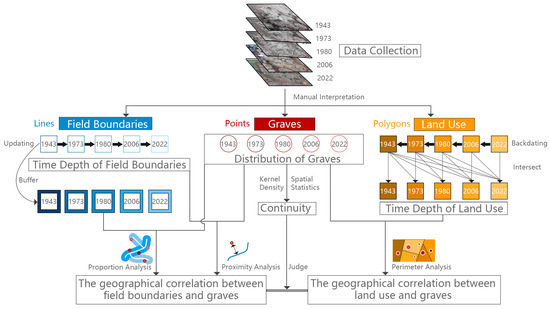 The paper’s workflow is depicted in Figure 4. Aerial photographs and satellite images from various periods were integrated into a geodatabase using georeferencing using ArcGIS Pro 3.0 (ESRI). Three spatial elements—graves, field boundaries, and land use—were extracted from these historical images using artificial recognition to discern landscape details in high-resolution images.