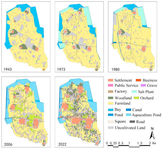 By 1973, most land use elements had remained consistent since 1943, with modern road systems under development. The original small woodlands diminished, and the northern bay was transformed into salt plants. Following the “In Agriculture, Learn from Dazhai” movement, 1980 saw a significant expansion of farmland, especially in previously uncultivated land and shallow bays. This phase also entailed the development of irrigation canals. Few woodlands remained after clearance for agriculture, but the expansion of settlements was very limited. In the next stage, there was a dramatic change in land use along with the commercialization of agriculture and the family-owned production model. By 2006, high-profit fruit planting replaced grain production, and orchards replaced farmland. Large areas of farmland were also abandoned to be replaced by uncultivated lands such as grassland. The direct reason for the abandonment was that more and more families gave up low-income agricultural production and turned to work in nearby big cities [57]. Since the plots owned by the families are scattered in space, the abandonment fragmented the landscape. Along with urbanization, settlements underwent substantial expansion, accompanied by the increase in scattered graves. Simultaneously, factories and commercial spaces emerged, all of which were indicative of the rapid population growth during that period. In addition, almost all of the natural bays had been reclaimed into ponds for aquaculture. The land use in 2022 continued the previous trend, showing extreme fragmentation. The abandonment of farmland and orchards persisted, succeeded by the cultivation of economic woodland (eucalyptus) with better profits. Along with the fragmented expansion of settlements, the entire district has become a mosaic-like landscape.
