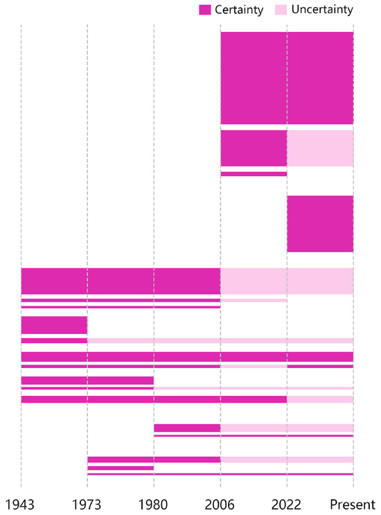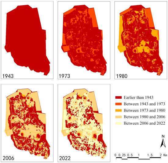 Time-depth maps of land use across five periods were generated by intersecting the land use maps (Figure 6). In 1973, the majority of land use persisted from 1943. By 1980, only the bays on both sides and the central highlands exhibited relatively new land use. By 2006, a large portion of the peninsula’s land use had changed. The distribution of these young fields appeared relatively fragmented, but in general, the fields dating back to before 1943 still encompassed around half of the district’s area. The trend of fragmentation continued until 2022, with newer uses dominating the peninsula and older plots exhibiting fragmentation.