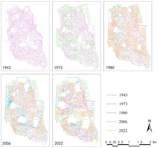 The time depth map was generated after assembling basic data. For the time depth of land use, the intersection of land use layers from five periods was initiated. The process sequentially compared whether land use on a specific plot remains consistent between two consecutive periods (T(n) and T(n − 1)). The time depth of land use at that plot corresponded to T(n) when differences arose. By iteratively reducing intersecting layers and repeating the process, landscape depth maps at five different periods were obtained. There was no need to draw time depth maps further because time information had been assigned to all the lines in field boundaries maps.