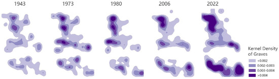 The distribution of graves appeared to display a consistent pattern, and graves appear to be persistent elements in landscape development. This hypothesis was assessed using two approaches. When the graves are regarded as points, the distribution pattern of graves in the five periods can be analyzed using the kernel density on GIS (Figure 8). As depicted in the figure, the spatial distribution pattern of graves remained stable over the 80-year landscape evolution. Notably, the absolute density value exhibited an increase due to the growing number of graves. Furthermore, several distribution hotspots displayed minimal alterations, reinforcing the enduring nature of this distribution pattern.