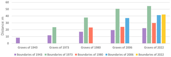 When we calculated the distance between the grave points and the field boundaries in different periods on the GIS, the result can be plotted in Figure 10. It is easy to find that no matter which period the graves belong to, they are closest to the earliest field boundaries (1943), which proves that graves tend to be positioned in close proximity to older boundaries.