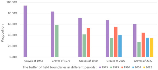 There is another piece of evidence provided by analyzing the buffer zone of field boundaries. Via testing, it was determined that buffer zones with a radius of 20 m could approximately cover the entire study area. This finding is illustrated in Figure 11, where the proportion of graves contained within these buffer zones is depicted. Similar to the previous method, there is always the highest proportion in the buffer zones based on boundaries in 1943. Even though, as time went by, the types of boundaries became more and more, which diluted the proportion of graves contained in the 1943 buffer, the graves contained in the 1943 buffer still accounted for 60% in 2022. This result reaffirms the close relationship between the graves and the oldest boundaries.