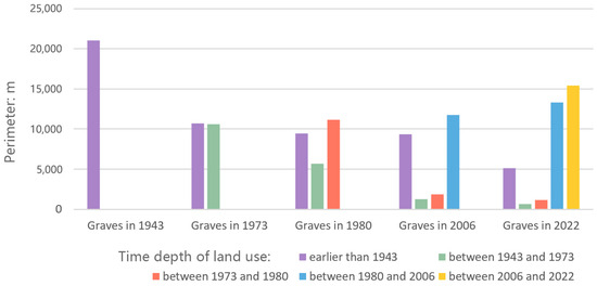 By contrast, the result is very different when we focus on the relationship between graves and the polygon element, time depth of land use. Figure 12 is plotted by counting the perimeter of the graves contained in polygons of different periods. A higher proportion of graves were situated on old fields before 1973, and after that, the proportion of graves contained the land earlier than 1943 dropped sharply. On the contrary, by 2022, most of the graves were located in the fields developed after 1980. Obviously, this result is contradictory to the previous one that suggested a stronger connection between graves and the oldest boundaries. In the following discussion, the reasons for these divergent results will be explained.