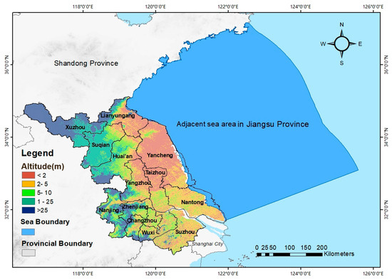 The study area (Figure 1) comprises two parts: the terrestrial area covering the entirety of Jiangsu Province and the sea area adjacent to Jiangsu Province, which is China’s claimed exclusive economic zone within the Yellow Sea area. Jiangsu Province is located on the eastern coast of mainland China, with a latitude ranging from 30°45′ to 35°20′ N and a longitude ranging from 116°18′ to 121°57′ E. Jiangsu borders Shandong Province to the north and the Yellow Sea to the east, with a total area of 107,200 km2. The examined sea area was within 200 nautical miles of the coastline of Jiangsu Province in the Yellow Sea, covering a total area of 176,400 km2.