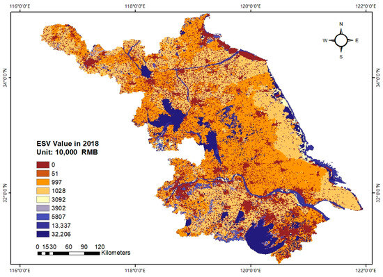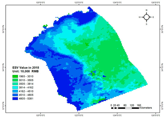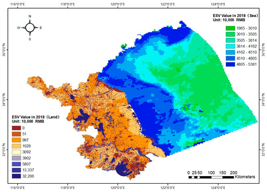 Figure 8. Distribution of ESVs in Jiangsu Province and its adjacent sea area in 2018.