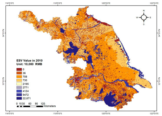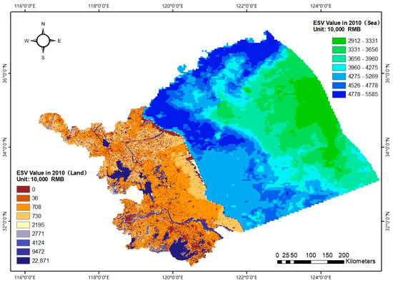 Figure 9. Distribution of ESVs in Jiangsu Province and its adjacent sea area in 2010.