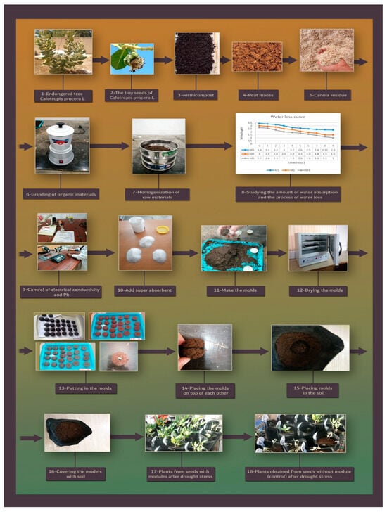 Subsequently, 2 g of each seed coating material was injected into a plastic half-circle (with a diameter of 5 cm), and the molds were dried at room temperature. They were maintained in a sterile environment until the beginning of the experiment (Figure 1). It should be noted that in the middle of one of the molds, there was a 4 mm deep hole for placing seeds. At the time of planting, two seeds were placed between the two halves of the molds and were planted in 5 L volume pots filled with growth medium “based on experimental treatments” (with one hole drilled in the bottom of each pot for drainage) (Figure 1), and one of them was removed. To apply the water stress, the field capacity of the soil was determined.